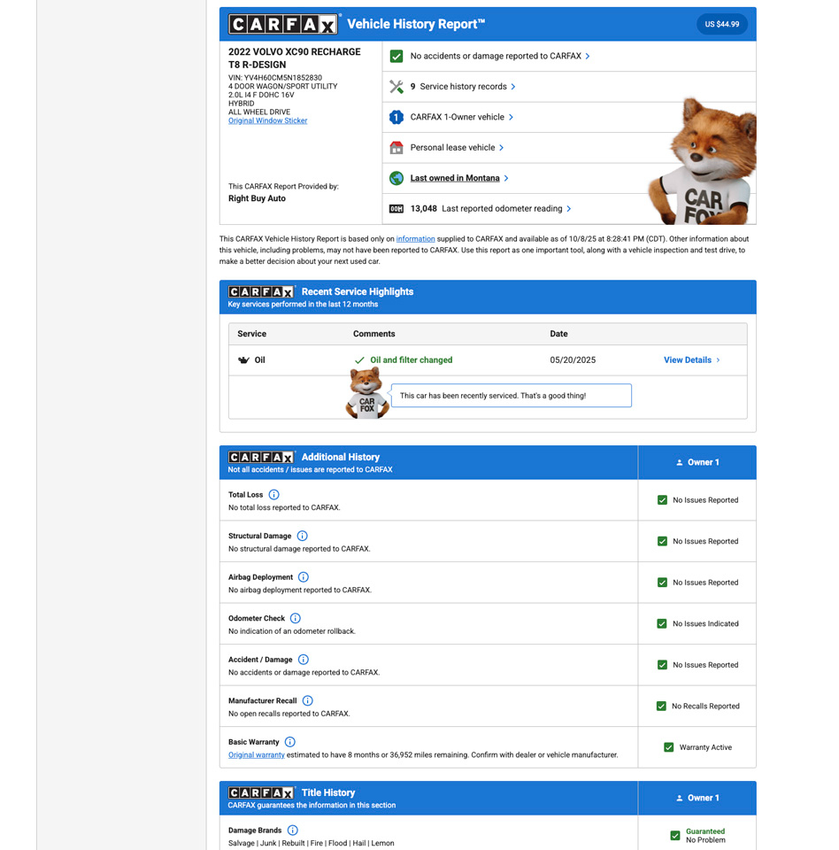 One Owner. Dealer maintained and serviced. Inspection performed. Full remaining factory warranty from Volvo. Original MSRP $77,465. This 2022 Volvo XC90 Recharge T8 R-Design Extended Range features a 2.0L Turbocharged & Supercharged 4-Cylinder Engine with Plug-in Hybrid Electric Motor producing 455HP/523TQ. Automatic All-Wheel Drive. 8-Speed Automatic Transmission. R-Design Package. R-Design Sport Seats with Nubuck/Textile Upholstery. R-Design Steering Wheel and Shifter. R-Design High-Gloss Black Mesh Grille. R-Design Sport Pedals. 20” R Design Alloy Wheels. Advanced Package. 360° Surround View Camera. Graphical Head-Up Display. Air Quality with Advanced Air Cleaner. Sun Curtain Rear Side Windows. Sensus Navigation Pro. Harman Kardon Premium Sound. Climate Package. Heated Steering Wheel. Heated Rear Seats. Heated Windshield Washer Nozzles. Harman Kardon Premium Sound. Panoramic Roof with Power Sunshade. LED Headlights with AHB & ABL. Blind Spot Information System with Steer Assist. Lane Keeping Aid. Cross Traffic Alert. Pilot Assist Driver Assistance System & Active Cruise Control. Collision Avoidance Support. Front & Rear Park Assist. Remote Keyless Entry. Apple CarPlay & Android Auto. Wireless Phone Charging. Power Front Seats with Driver Memory. Ventilated Front Seats with Power Cushion Extensions. Power Adjustable Side Support. Heated and Cooled Cupholders. Hands-Free Power Liftgate. Ambient Interior Illumination. Towing Prep with Trailer Stability Assist. Every Vehicle at Right Buy comes with a full inspection report. CarFax vehicle history report. Affordable extended coverage options and low-rate financing options. Set an appointment to view the vehicle in our heated indoor showroom. PRIME PROTECT LEVEL 3 EXCLUSIONARY COVERAGE AVAILABLE 1 YEAR 12K MILES FOR $2,463 OR 5 YEAR 100K FOR $2,903.