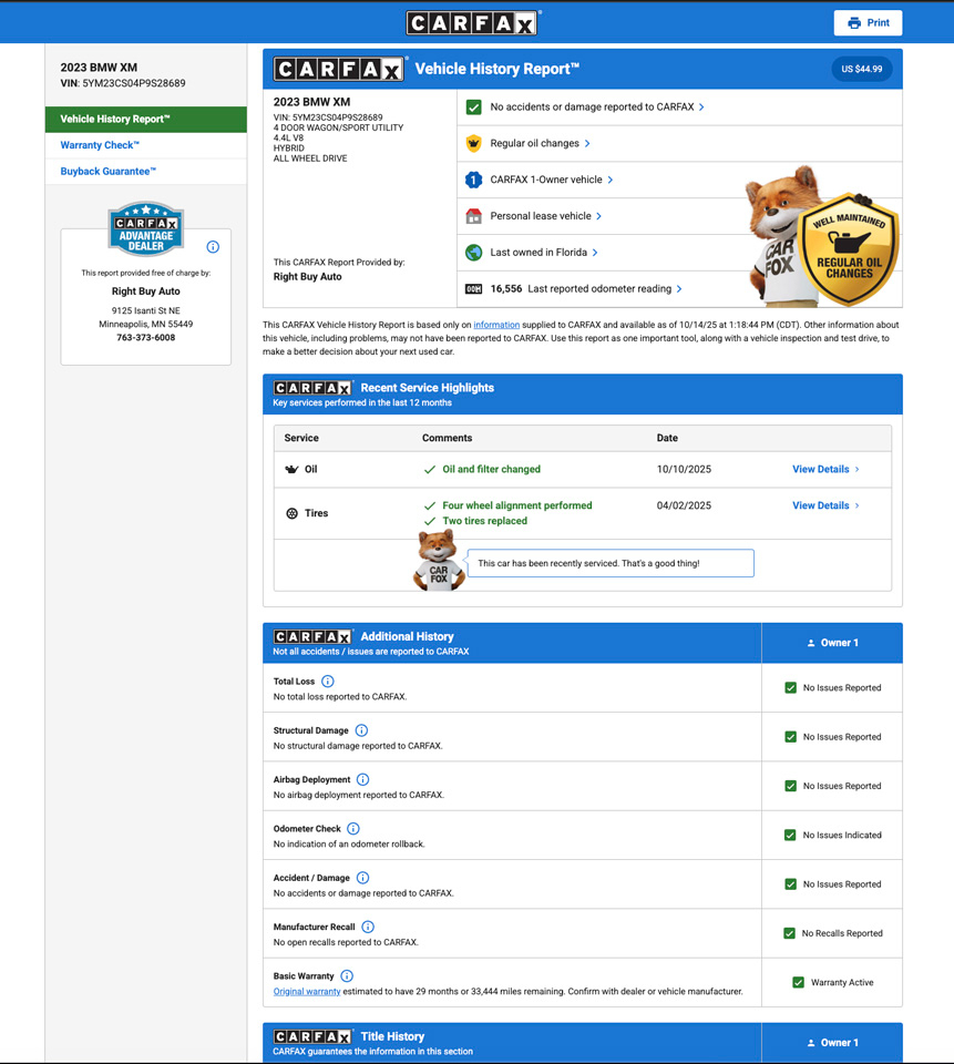 One Owner. Dealer maintained and serviced. Inspection performed. Full remaining factory warranty coverage from BMW. Original MSRP $166,395. This 2023 BMW XM features a 4.4L BMW M Turbo V8 Engine paired with a High-Performance Electric Motor producing a combined 644HP/590TQ. 8-Speed Automatic Transmission. xDrive All-Wheel Drive. Mineral White Metallic Exterior. Sakhir Orange/Black Merino Leather Interior. M Sport Package with Red Calipers. Bowers & Wilkins Diamond Surround Sound System. Extended Merino Leather Upholstery. Heated and Ventilated Front Seats. Heated Rear Seats. Front Massage Seats. Heated Steering Wheel. 4-Zone Automatic Climate Control. Iconic Glow Grille. Wireless Device Charging. BMW Curved Display with iDrive 8. BMW Live Cockpit Pro with Navigation. Head-Up Display with Augmented Reality. Apple CarPlay & Android Auto. BMW ConnectedDrive Services. WiFi Hotspot with Complimentary Data. Shadowline Exterior Trim. Carbon Fiber Interior Trim. 23” M Double Spoke Wheels. Adaptive M Suspension Professional. Active Roll Stabilization. Integral Active Steering. Active Driving Assistant Pro. Extended Traffic Jam Assistant. Surround View with 3D View. Parking Assistant Plus. Ambient Lighting. Panoramic Sky Lounge LED Roof. Soft-Close Automatic Doors. Comfort Access Entry. Power Tailgate. M Performance Exhaust. Every Vehicle at Right Buy comes with a full inspection report. CarFax vehicle history report. Affordable extended coverage options and low-rate financing options. Set an appointment to view the vehicle in our heated indoor showroom.