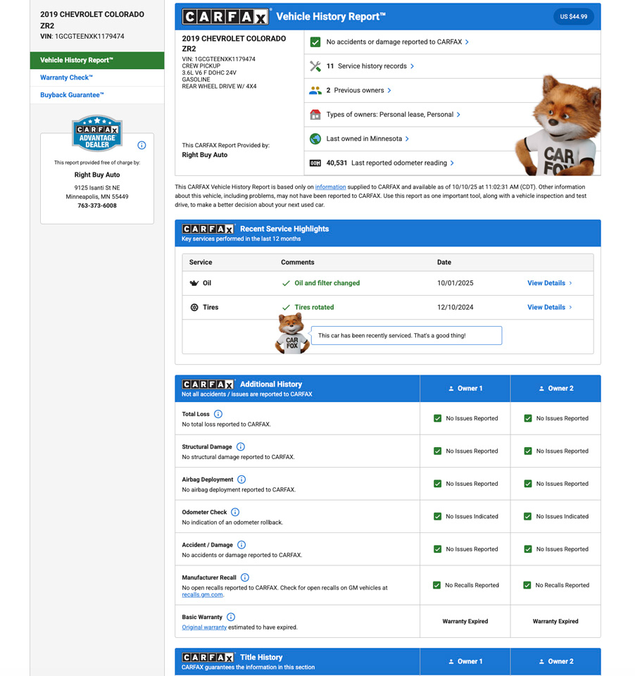 Dealer maintained and serviced. Inspection performed. This 2019 Chevrolet Colorado ZR2 features a 3.6L V6 Engine 306HP/275TQ. 8-Speed Automatic Transmission. 4WD. Red Hot Exterior Color. Jet Black Interior. ZR2 Dusk Special Edition. Leather-Appointed Seating. ZR2 Off-Road Suspension Package. Multimatic DSSV Damping System. Locking Front and Rear Differentials. Skid Plates. Power Fold Away Running Boards. Tow Package with Trailer Hitch and 7-Pin Connector. Spray-On Bedliner. EZ Lift & Lower Tailgate. Off-Road Rocker Protection. 17” Black Aluminum Wheels. Projector Beam Headlamps. Fog Lamps. Heated Power Outside Mirrors. Chevrolet Infotainment System with 8” Touchscreen. Apple CarPlay & Android Auto. Bluetooth Audio and Phone. Rear Vision Camera. Wireless Charging. USB Ports. Premium Audio System. Power Adjustable Driver Seat. Heated Front Seats. Remote Vehicle Start. Keyless Entry. Automatic Climate Control. Rear Sliding Window. Off-Road Appearance Package. Advanced Safety Features with Airbags, Rear Child Security Locks, Tire Pressure Monitoring System. Bose 7 Speaker Premium Audio System. Every vehicle at Right Buy comes with a full inspection report. CarFax vehicle history report. Affordable extended coverage options and low-rate financing options. Set an appointment to view the vehicle in our heated indoor showroom. PRIME LEVEL 3 EXCLUSIONARY COVERAGE AVAILABLE 1 YEAR 12K MILES FOR $2,570 OR 6 YEAR 100K FOR $3,371.