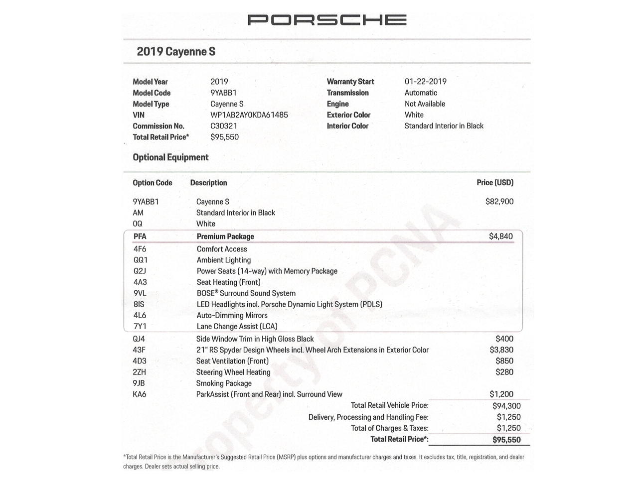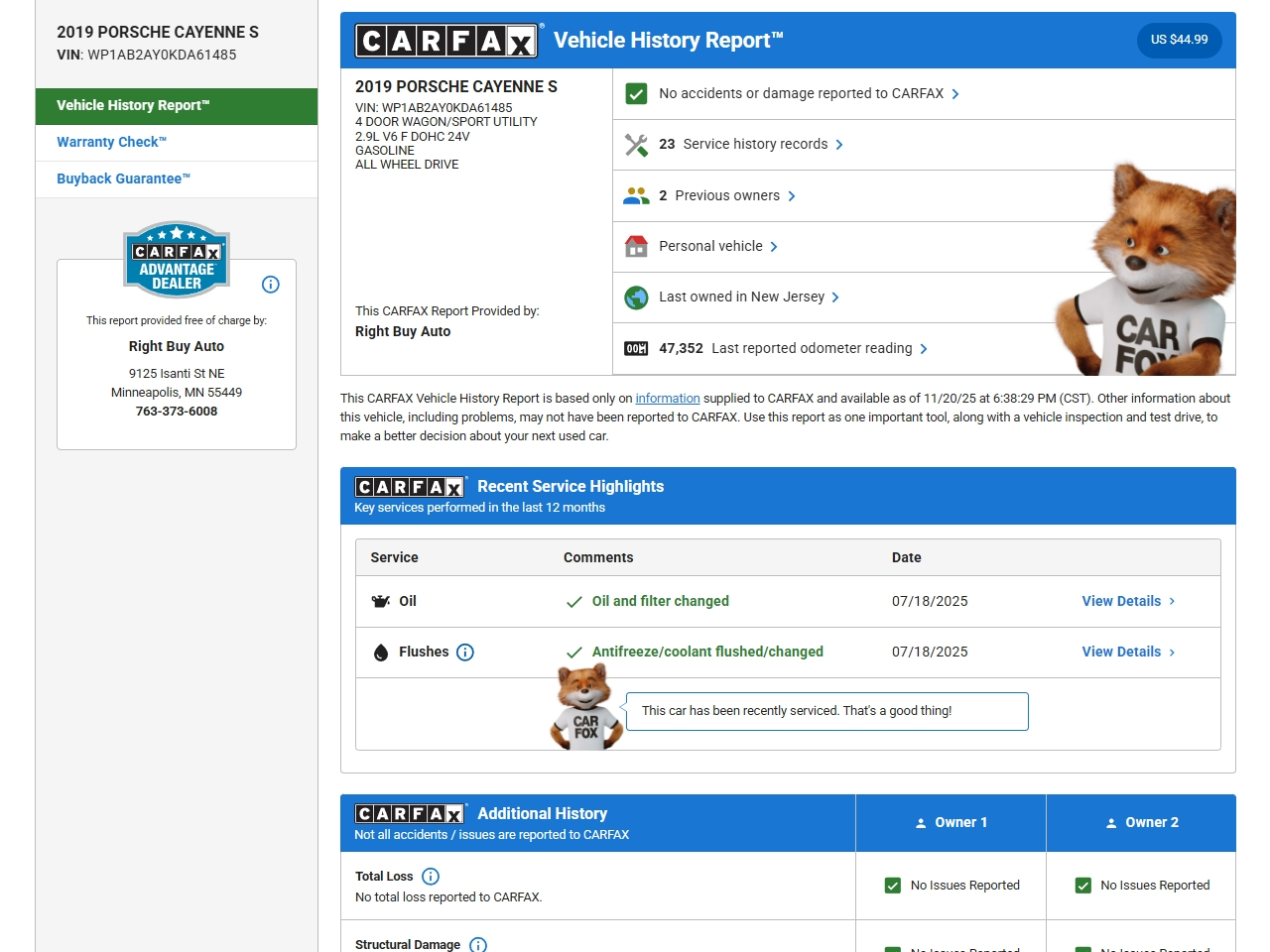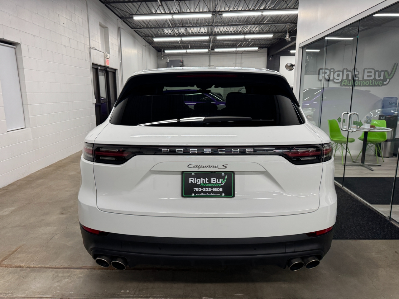 Dealer maintained and serviced. Inspection performed. Porsche Certified Pre-Owned (CPO) coverage until 08/2027. Original MSRP $96,550. This 2019 Porsche Cayenne S features a 2.9L Twin-Turbocharged V6 Engine producing 434HP/405TQ. 8-Speed Tiptronic S Automatic Transmission. All-Wheel Drive. White Exterior. Black Leather Interior. Premium Package. 14-Way Power Adjustable Front Seats with Memory Package. Heated and Ventilated Front Seats. Heated Steering Wheel. BOSE Surround Sound System. Comfort Access Keyless Entry. Ambient Lighting. LED Headlights with Porsche Dynamic Light System (PDLS). Auto-Dimming Mirrors. Lane Change Assist. 21” RS Spyder Design Wheels in High Gloss Black with Body-Color Wheel Arch Extensions. ParkAssist Front and Rear with Surround View. Power Tailgate. Dual-Zone Automatic Climate Control. Power Adjustable Steering Column. Rain-Sensing Wipers. Panoramic Roof. Power Folding Mirrors. Porsche Communication Management (PCM) with Navigation. Apple CarPlay. Bluetooth Connectivity. Every Vehicle at Right Buy comes with a full inspection report. CarFax vehicle history report. Affordable extended coverage options and low-rate financing options. Set an appointment to view the vehicle in our heated indoor showroom. PRIME PROTECT LEVEL 3 EXCLUSIONARY COVERAGE AVAILABLE 1 YEAR 12K MILES FOR $3,190 OR 5 YEAR 100K MILES FOR $4,484 OTHER TERMS AVAILABLE.
