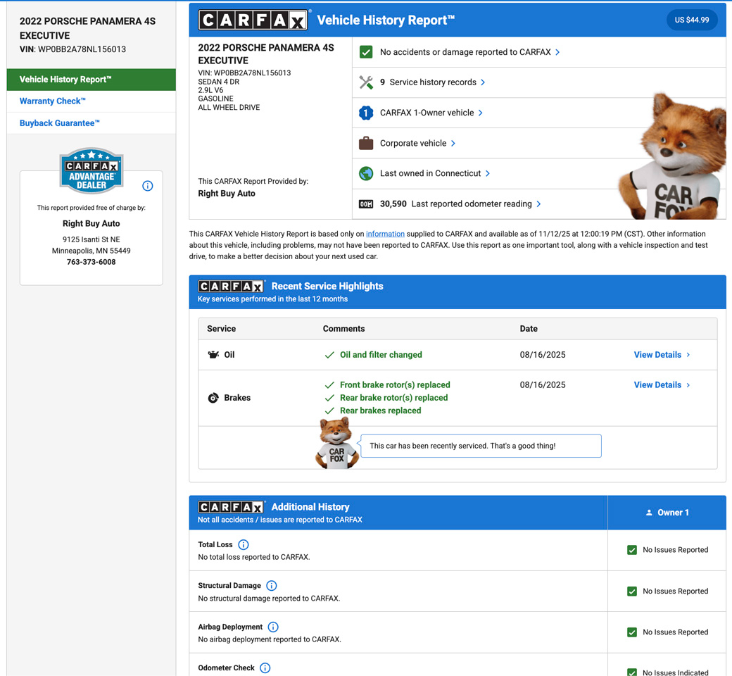 One Owner. Dealer maintained and serviced. Inspection performed. Remaining factory warranty from Porsche. Original MSRP $162,430. This 2022 Porsche Panamera 4S Executive features a 2.9L Twin-Turbocharged V6 Engine producing 443HP/405TQ. 8-Speed Porsche Doppelkupplung (PDK) Automatic Transmission. All-Wheel Drive. Black Leather Interior. Executive Wheelbase Model – Extended Rear Seating and Legroom. Sport Chrono Package. Premium Package. 4-Zone Automatic Climate Control. Ventilated Front and Rear Seats. Heated Front and Rear Seats. Heated Steering Wheel. Massaging Seats Front & Rear. Lane Change Assist. Porsche Crest on Headrests. Power Sunblinds for Rear Windows. Heated Steering Wheel. Burmester Surround Sound System. Assistance Package. Porsche Innodrive Adaptive Cruise Control. Soft-Close Doors. LED Matrix Design Headlights with Porsche Dynamic Light System Plus (PDLS+). Lane Change Assist. Adaptive Cruise Control. Surround View with Active Parking Support. Head-Up Display. Power Sunroof. Power Rear Tailgate. Porsche Entry & Drive. 21” Panamera Design Wheels. Ambient Lighting. Adaptive Air Suspension with PASM. Power Adjustable Front Seats with Memory. Heated Multifunction Steering Wheel. 18-Way Power Comfort Seats. Navigation System. Apple CarPlay. Porsche Connect with Online Services. Front and Rear ParkAssist. Every Vehicle at Right Buy comes with a full inspection report. CarFax vehicle history report. Affordable extended coverage options and low-rate financing options. Set an appointment to view the vehicle in our heated indoor showroom. PRIME LEVEL 3 EXCLUSIONARY COVERAGE AVAILABLE 1 YEAR 12K MILES FOR $3,363 OR 5 YEAR 100K MILES FOR $4,847 OTHER COVERAGE TERMS AVAILABLE.