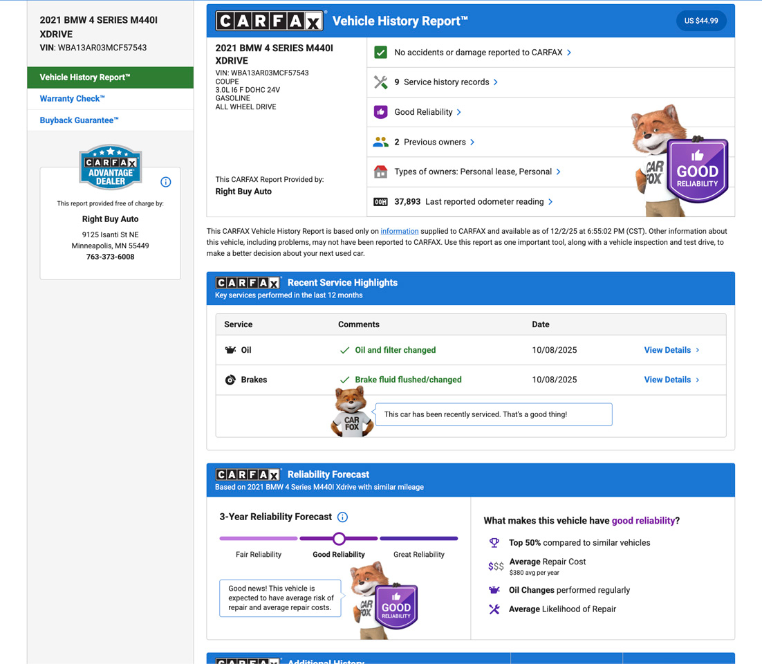 Dealer maintained and serviced. Original MSRP $68,720. This BMW M440i xDrive Features a 3.0L Turbo 6 Cylinder Engine 382HP/369TQ. 8 Speed Sport Automatic Transmission. All Wheel Drive. Premium Package. Shadowline Package. Adaptive M Suspension. Heated Front Seats & Steering Wheel. Ambient Lighting. Heads Up Display. Sunroof. Harman Kardon Surround Sound. Wireless Charging. Live Cockpit Pro. Enhanced USB & Bluetooth. Apple Carplay & Android Auto. Remote Start. Connected Package Pro. Lumbar Support. Front & Rear Park Distance Control. Rearview Camera. Auto Dimming Mirrors. Navigation System. Keyless Comfort Access. Tire Pressure Monitoring. Every Vehicle at Right Buy comes with a full inspection report. CarFax vehicle history report. Affordable extended coverage options and low-rate financing options. Set an appointment to view the vehicle in our heated indoor showroom. PRIME LEVEL 3 EXCLUSIONARY COVERAGE AVAILABLE 1 YEAR 12K MILES FOR $3,029 OR 5 YEAR 100K MILES FOR $3,736 OTHER TERMS AVAILABLE.