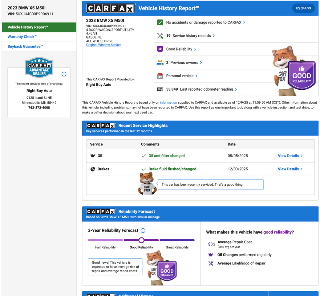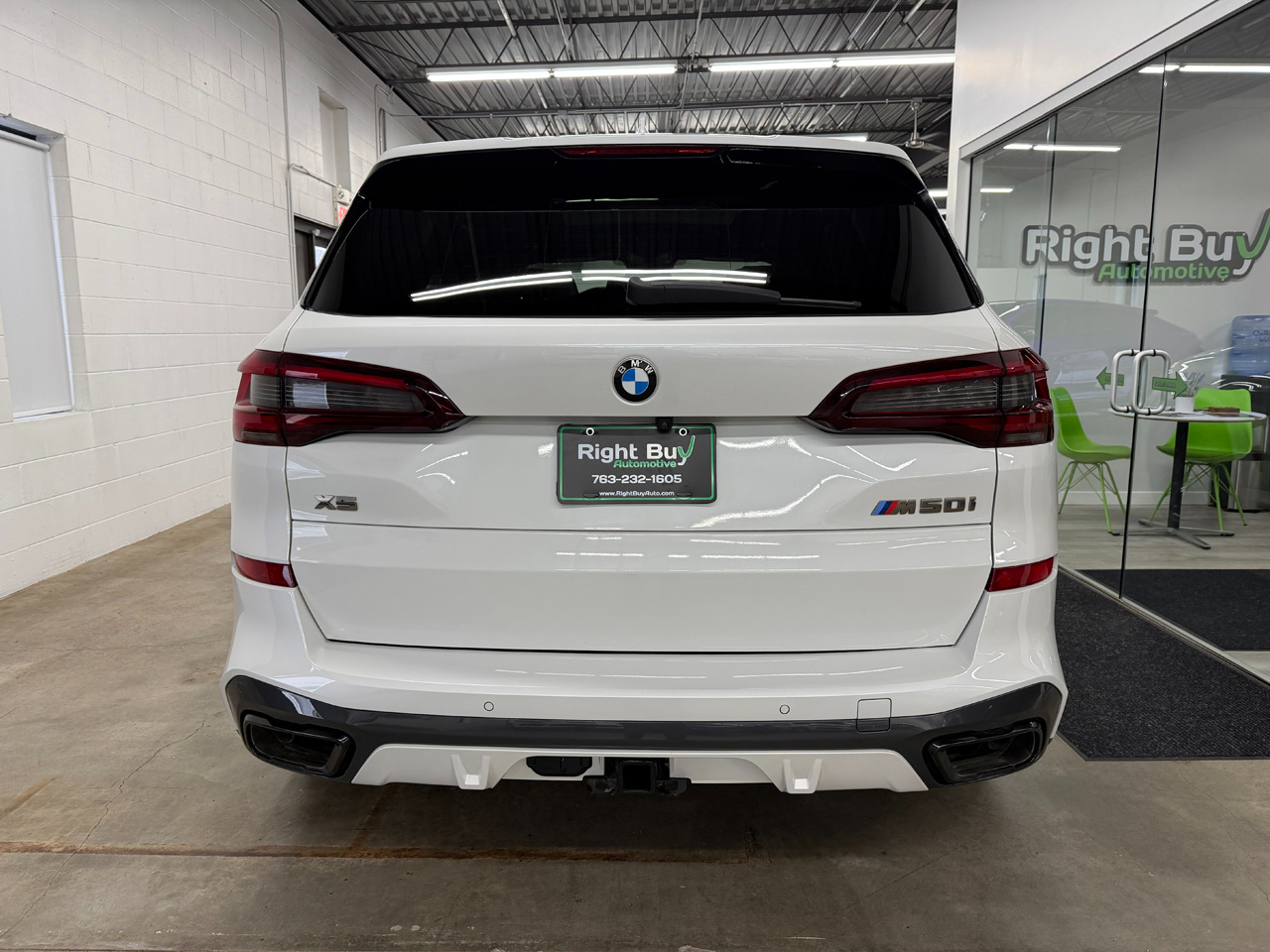 Dealer maintained and serviced. Inspection performed. This 2023 BMW X5 M50i features a 4.4L Turbo V8 producing 523HP/553TQ. 8-Speed Automatic Transmission. xDrive All-Wheel Drive. Mineral White Metallic Exterior. Silverstone Interior. Driving Assistance Pro Package. Parking Assistance Package. Executive Package. Climate Comfort Package. 22” M Double-Spoke Black Wheels. M Sport Exhaust System. M Sport Brakes with Red Calipers. M Sport Differential. Adaptive M Suspension. Integral Active Steering. Remote Engine Start. Soft-Close Automatic Doors. Comfort Access Keyless Entry. Heated & Cooled Front Seats. Heated Rear Seats. Heated Steering Wheel. Panoramic Roof. Ambient Lighting. 4-Zone Climate Control. Harman Kardon Surround Sound. Heads Up Display. Multi Contour Seats. Apple CarPlay & Android Auto. ConnectedDrive Services. Connected Package Pro. Wireless Charging. WiFi Hotspot. Extended Shadowline Trim. Trailer Hitch. M 50 Years Emblems. Active Driving Assistant Pro with Lane Keep & Steering Assist. Parking Assistant Plus with Surround View 3D. Rearview Camera. Park Distance Control. Extended Traffic Jam Assist. Blind Spot Detection. Lane Departure Warning. Comfort Keyless Access. Every vehicle at Right Buy comes with a full inspection report. CarFax vehicle history report. Affordable extended coverage options and low-rate financing options. Set an appointment to view the vehicle in our heated indoor showroom. PRIME PROTECT LEVEL 3 EXCLUSIONARY COVERAGE AVAILABLE 1 YEAR / 12K MILES FOR $3,478 OR 4 YEARS / 75K MILES FOR $4,589 OTHER COVERAGE TERMS AVAILABLE.